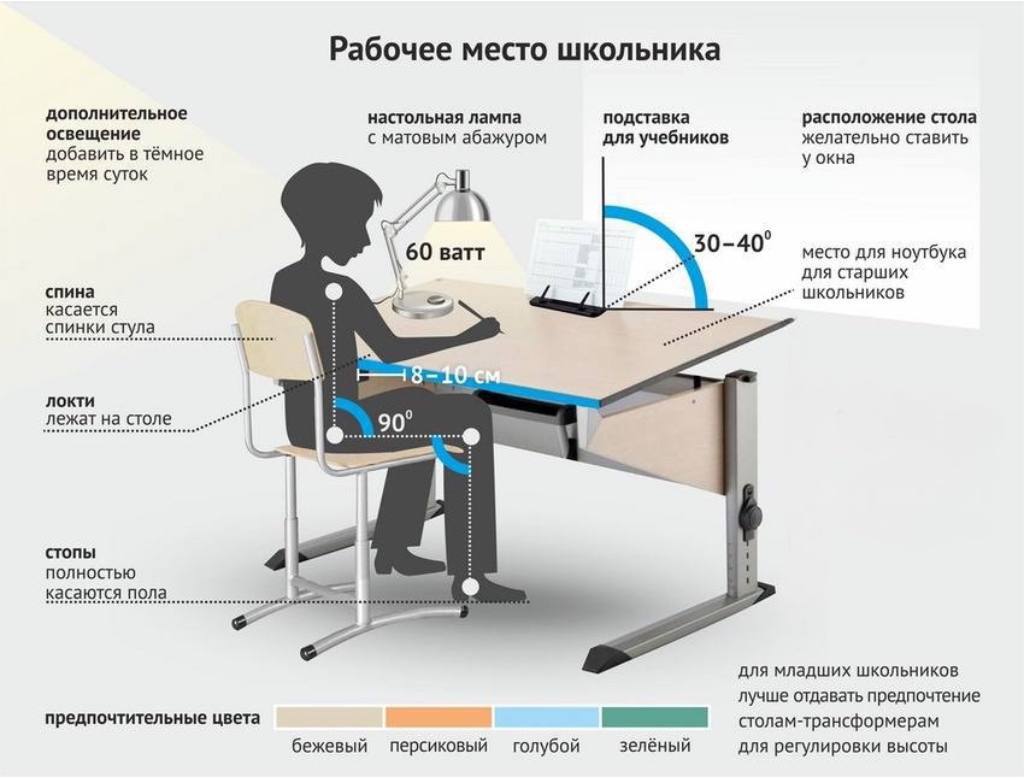 Важно обустроить дома рабочее место ребенка. Правильно организованное оно – важный фактор профилактики нарушений осанки и зрения. Рабочий стол должен «расти» вместе с учеником. Лучше всего приобрести стол-трансформер с регулируемой высотой и углом наклона. Перед покупкой стола необходимо посадить за него ребенка. Столешница должна находиться примерно на уровне солнечного сплетения. Если попросить ученика поставить на стол локти, а ладошки вытянуть вверх так, словно он поднял руку для ответа, то при идеальной посадке кончик большого пальца должен находиться на одном уровне с глазами. Оптимальная высота стола – на 2–3 см ниже локтя ребенка (в положении стоя).