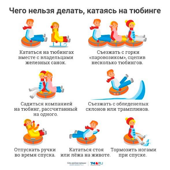 Лежа на животе, на коленях и других позах катание опасно. В подобных позах Вы едва ли сможете крепко держаться за ручки тюбинга, что может привести к падению. Помните, что торможение руками, ногами и вообще касание земли на скорости – недопустимо.